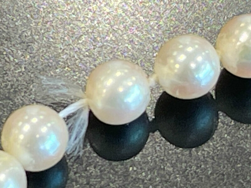 ・留め具を外し、真珠のネックレスをまっすぐ垂らしたときに真珠真珠の間に5mm以上の隙間ができる場合、糸替えが必要です。糸が劣化して伸びている可能性があります。
