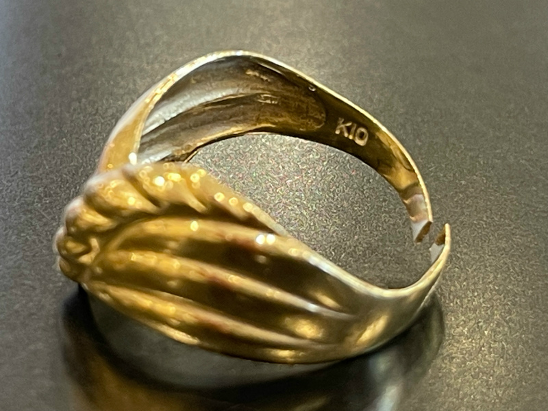 K10は金が約42%で、残りは銅やシルバーなどの金属構成でされています。これらの金属が多く含まれるため、K加工部分18(金含有量約75%)と比べて硬いので、もろく割れやすい性質があります。