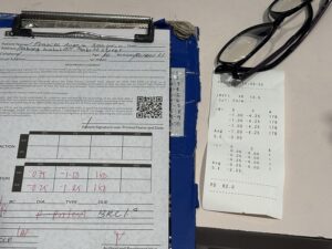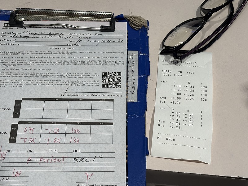 検眼後の最終決定値もこっそりと撮っちゃいました。オートレフ値からのデータ、初装で乱視が強くどう出すかと思えばそれなりに合格点(私が言うのも何ですが・・・)の検眼データでした。