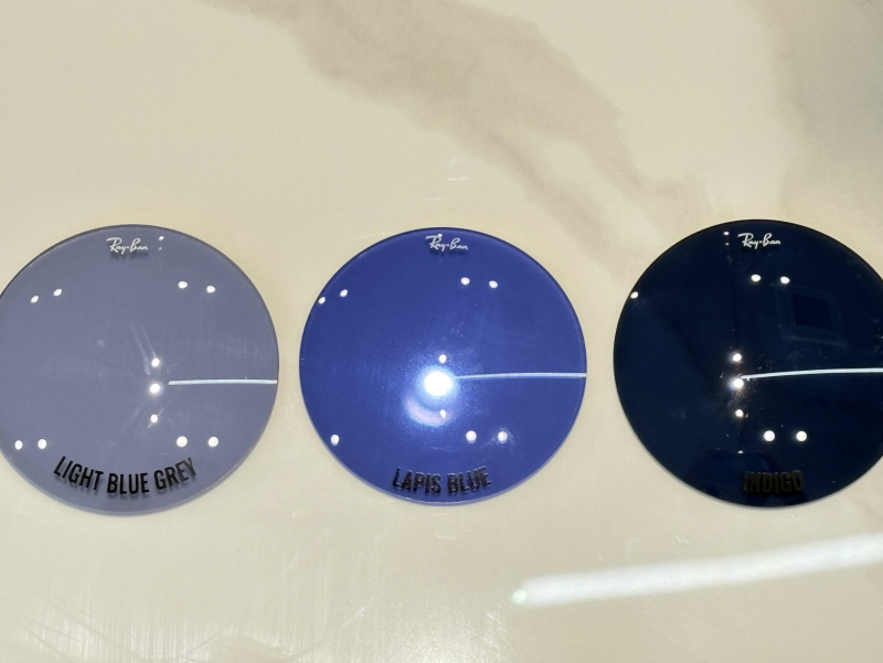 現在、クラブマスターのサングラスで販売されている上記のフレームカラーかつブルー系のカラーレンズの組み合わせは、上記で当店でも在庫があると書きましたレンズがライトブルーグレーのみでした。そこで、純正レンズのカラーサンプルで確認したところ、お客様のご希望に合うライトブルーグレーとブルーの中間色になる画像だと真ん中のカラー、ラピスブルーが気に入りラピスブルーで製作しました。ラインナップにないサングラスもカスタムでは選択肢にないレンズカラーも純正レンズだと作れます。純正レンズなので、もちろんレイバンのロゴ入りです。
